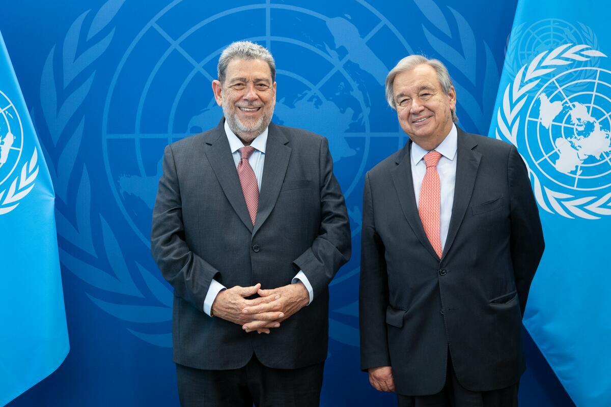 Foto: UN | O antigo primeiro-ministro de São Vicente e Granadinas, Ralph Gonsalves (esq.), com o secretário-geral das Nações Unidas, o português António Guterres