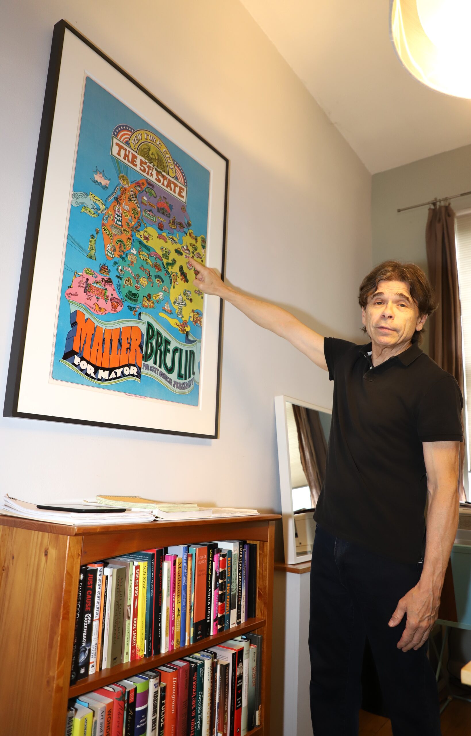 Foto: JORNAL LUSO-AMERICANO | O jornalista mostra a cópia de um cartaz de campanha de Breslin quando o colunista concorreu (sem êxito) à Câmara de Nova Iorque